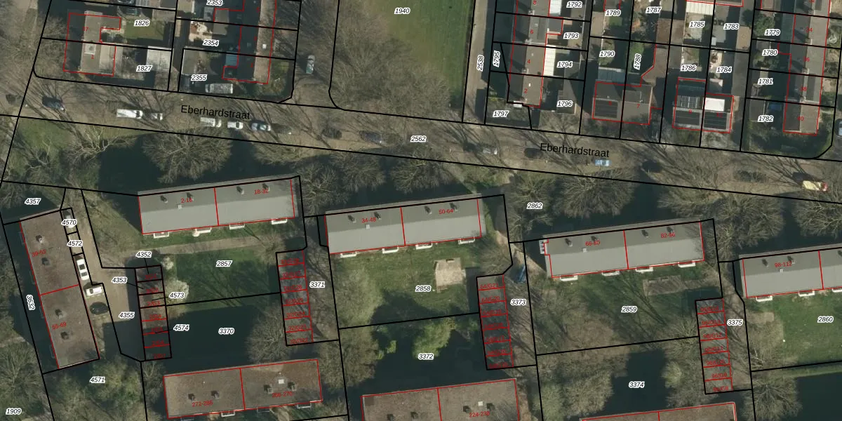 Het perceel waarop Eberhardstraat 50 staat heeft een oppervlakte van 1105 m². Dit is een zeer groot perceel. De perceeloppervlakte wordt geregistreerd door het Kadaster. Gedetailleerde informatie over de maten van dit perceel kunt u vinden in het rapport Kadastrale kaart met maatvoering van Eberhardstraat 50.