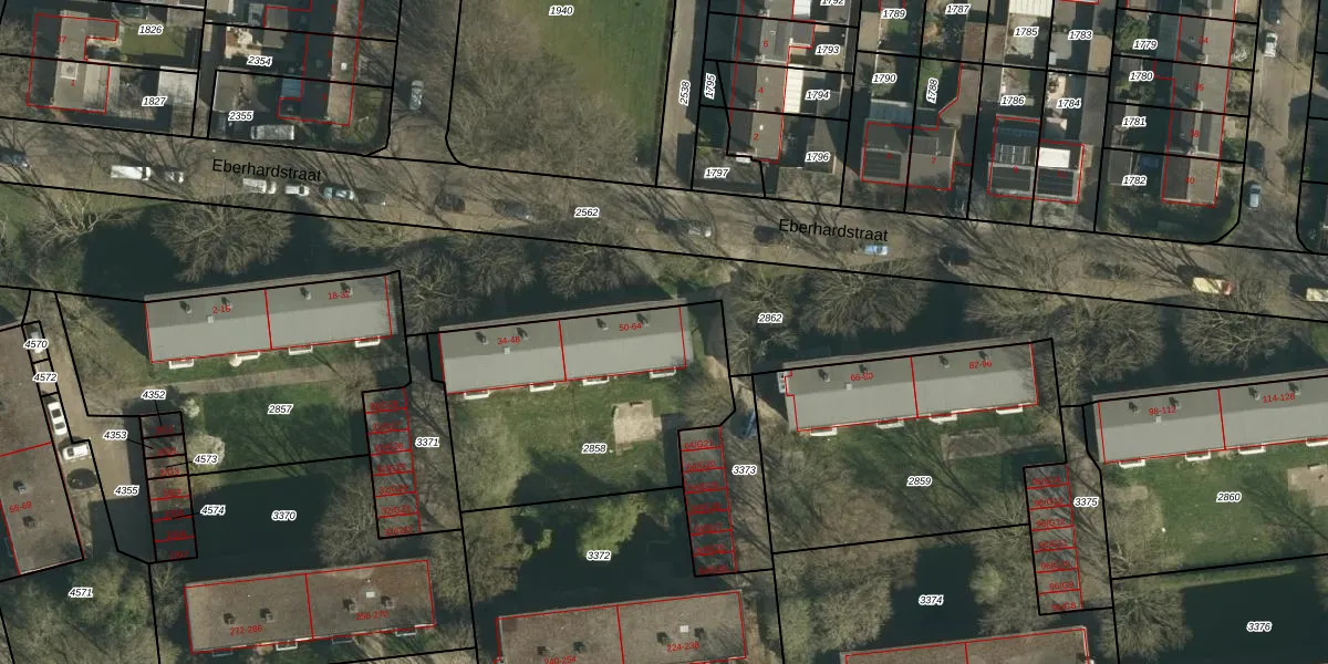 Het perceel waarop Eberhardstraat 56 staat heeft een oppervlakte van 1105 m². Dit is een zeer groot perceel. De perceeloppervlakte wordt geregistreerd door het Kadaster. Gedetailleerde informatie over de maten van dit perceel kunt u vinden in het rapport Kadastrale kaart met maatvoering van Eberhardstraat 56.