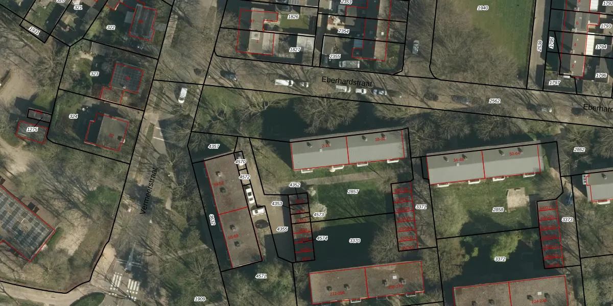 Het perceel waarop Eberhardstraat 6 staat heeft een oppervlakte van 1140 m². Dit is een zeer groot perceel. De perceeloppervlakte wordt geregistreerd door het Kadaster. Gedetailleerde informatie over de maten van dit perceel kunt u vinden in het rapport Kadastrale kaart met maatvoering van Eberhardstraat 6.