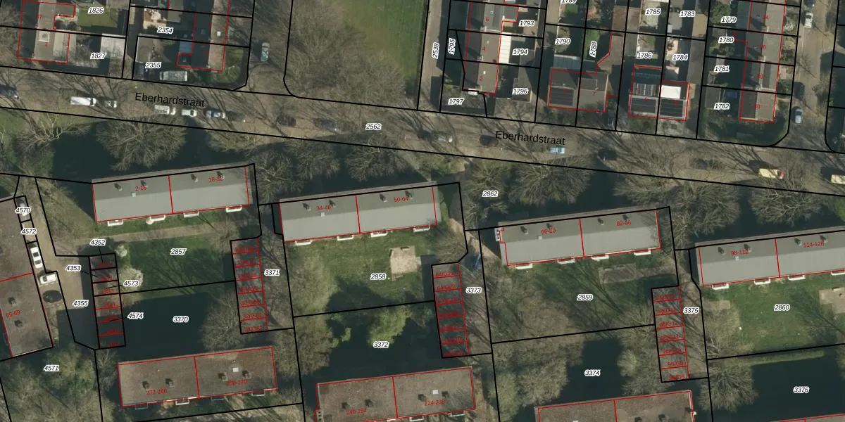 Het perceel waarop Eberhardstraat 60 staat heeft een oppervlakte van 1105 m². Dit is een zeer groot perceel. De perceeloppervlakte wordt geregistreerd door het Kadaster. Gedetailleerde informatie over de maten van dit perceel kunt u vinden in het rapport Kadastrale kaart met maatvoering van Eberhardstraat 60.