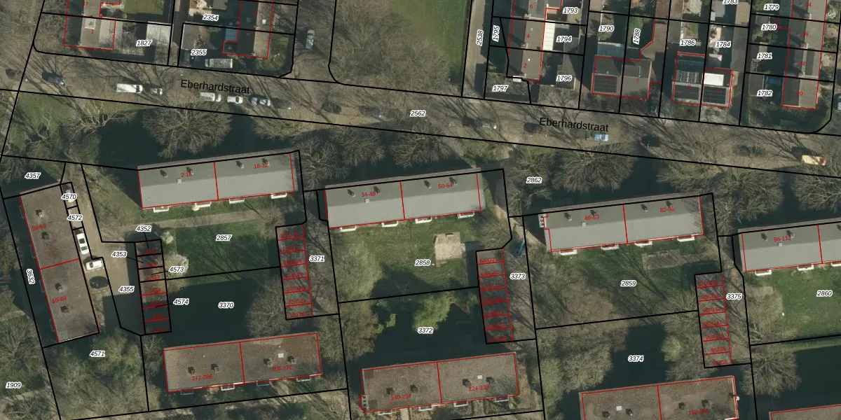 Het perceel waarop Eberhardstraat 62 staat heeft een oppervlakte van 1105 m². Dit is een zeer groot perceel. De perceeloppervlakte wordt geregistreerd door het Kadaster. Gedetailleerde informatie over de maten van dit perceel kunt u vinden in het rapport Kadastrale kaart met maatvoering van Eberhardstraat 62.