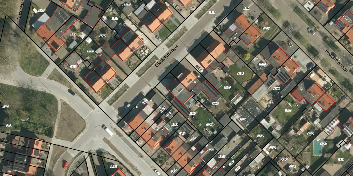 Het perceel waarop Gladiolensingel 2 staat heeft een oppervlakte van 534 m². Dit is een groot perceel. De perceeloppervlakte wordt geregistreerd door het Kadaster. Gedetailleerde informatie over de maten van dit perceel kunt u vinden in het rapport Kadastrale kaart met maatvoering van Gladiolensingel 2.
