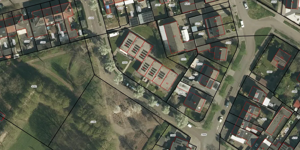Het perceel waarop Jasmijnstraat 46 staat heeft een oppervlakte van 1570 m². Dit is een zeer groot perceel. De perceeloppervlakte wordt geregistreerd door het Kadaster. Gedetailleerde informatie over de maten van dit perceel kunt u vinden in het rapport Kadastrale kaart met maatvoering van Jasmijnstraat 46.