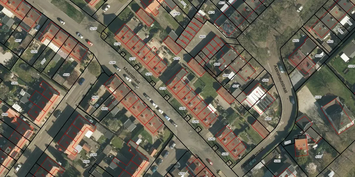 Het perceel waarop Maanstraat 40 staat heeft een oppervlakte van 3210 m². Dit is een zeer groot perceel. De perceeloppervlakte wordt geregistreerd door het Kadaster. Gedetailleerde informatie over de maten van dit perceel kunt u vinden in het rapport Kadastrale kaart met maatvoering van Maanstraat 40.
