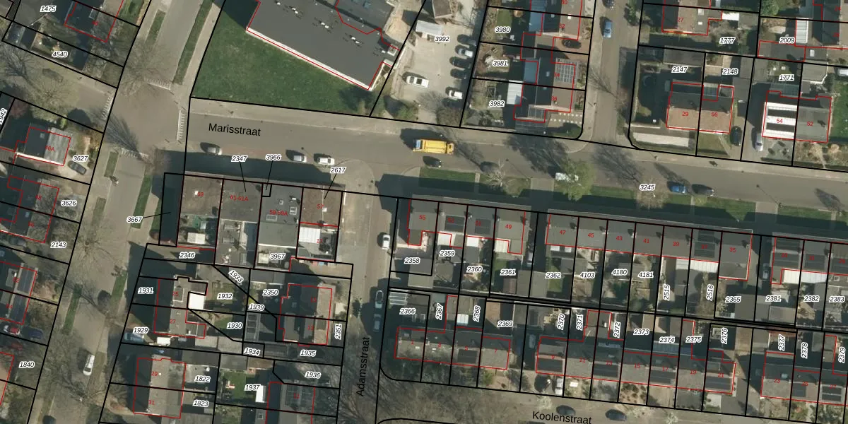Marisstraat 55 is gelegen op kadastraal perceel GLN00F2358. Deze kadastrale aanduiding is uniek en wordt gebruikt door het Kadaster om eigendomsrechten en andere zakelijke rechten vast te leggen. Het perceel maakt onderdeel uit van de kadastrale gemeente Geleen.