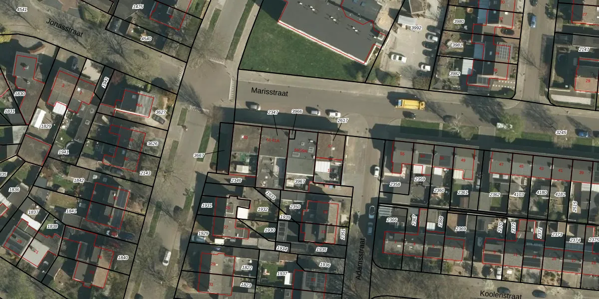 Marisstraat 59 is gelegen op kadastraal perceel GLN00F3967. Deze kadastrale aanduiding is uniek en wordt gebruikt door het Kadaster om eigendomsrechten en andere zakelijke rechten vast te leggen. Het perceel maakt onderdeel uit van de kadastrale gemeente Geleen.