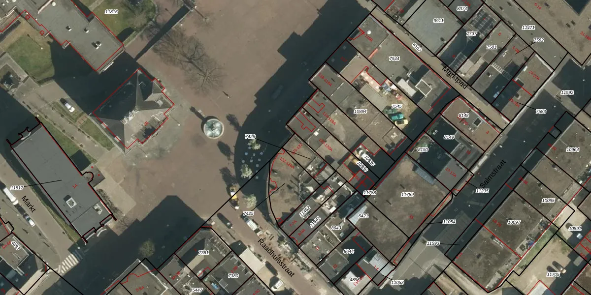 Het perceel waarop Markt 121 staat heeft een oppervlakte van 125 m². Dit is een middelgroot perceel. De perceeloppervlakte wordt geregistreerd door het Kadaster. Gedetailleerde informatie over de maten van dit perceel kunt u vinden in het rapport Kadastrale kaart met maatvoering van Markt 121.