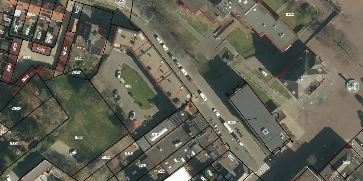 Het perceel waarop Markt 13 staat heeft een oppervlakte van 2011 m². Dit is een zeer groot perceel. De perceeloppervlakte wordt geregistreerd door het Kadaster. Gedetailleerde informatie over de maten van dit perceel kunt u vinden in het rapport Kadastrale kaart met maatvoering van Markt 13.