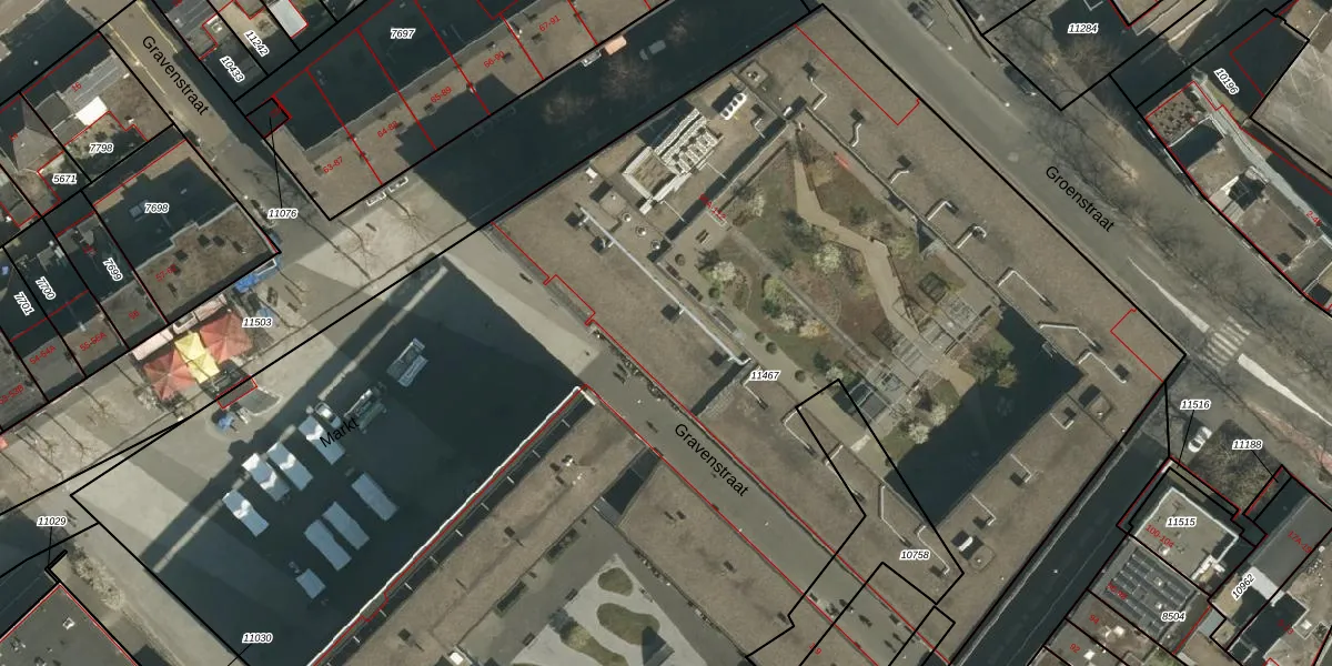 Het perceel waarop Markt 99-I staat heeft een oppervlakte van 1,2 ha. Dit is een zeer groot perceel. De perceeloppervlakte wordt geregistreerd door het Kadaster. Gedetailleerde informatie over de maten van dit perceel kunt u vinden in het rapport Kadastrale kaart met maatvoering van Markt 99-I.