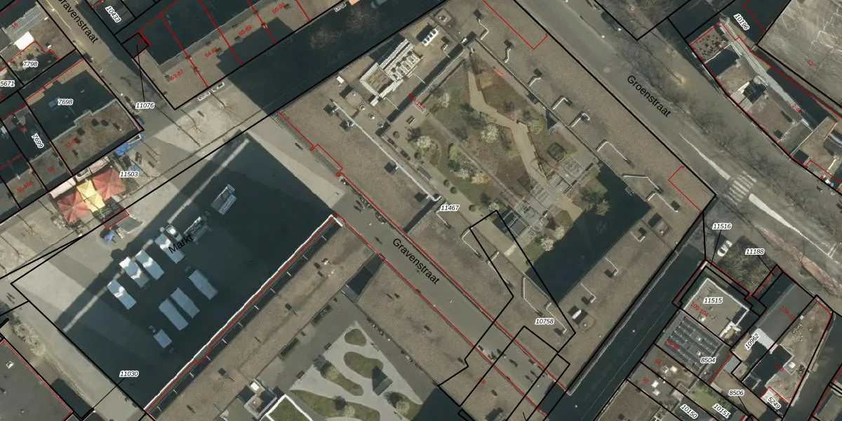 Het perceel waarop Markt 99-J staat heeft een oppervlakte van 1,2 ha. Dit is een zeer groot perceel. De perceeloppervlakte wordt geregistreerd door het Kadaster. Gedetailleerde informatie over de maten van dit perceel kunt u vinden in het rapport Kadastrale kaart met maatvoering van Markt 99-J.
