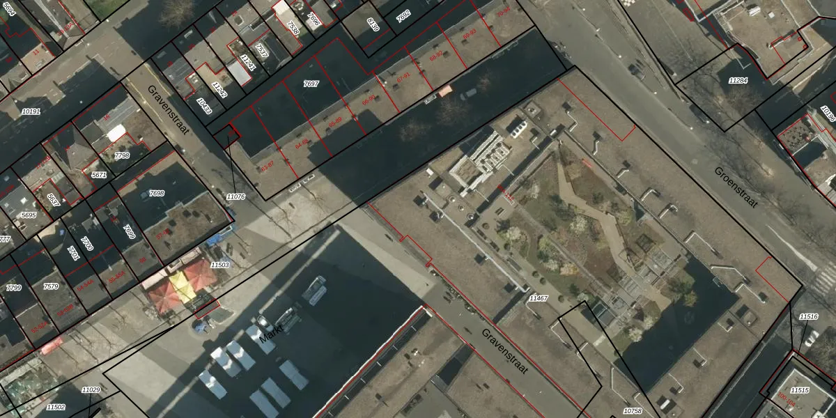 Het perceel waarop Markt 99-U staat heeft een oppervlakte van 1,2 ha. Dit is een zeer groot perceel. De perceeloppervlakte wordt geregistreerd door het Kadaster. Gedetailleerde informatie over de maten van dit perceel kunt u vinden in het rapport Kadastrale kaart met maatvoering van Markt 99-U.