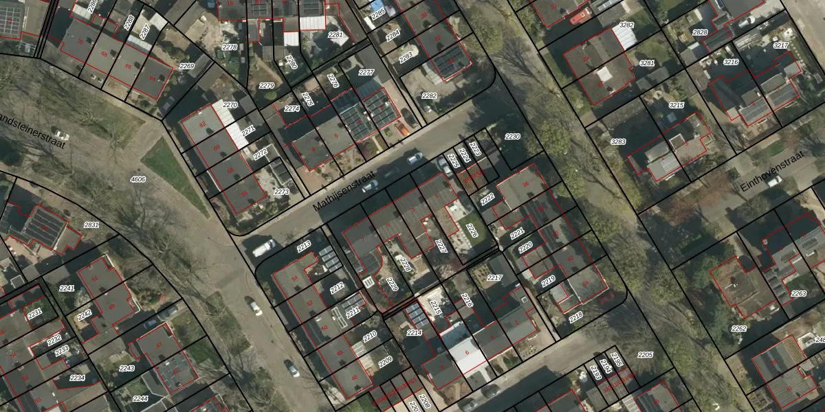 Het perceel waarop Mathijsenstraat 3 staat heeft een oppervlakte van 192 m². Dit is een middelgroot perceel. De perceeloppervlakte wordt geregistreerd door het Kadaster. Gedetailleerde informatie over de maten van dit perceel kunt u vinden in het rapport Kadastrale kaart met maatvoering van Mathijsenstraat 3.