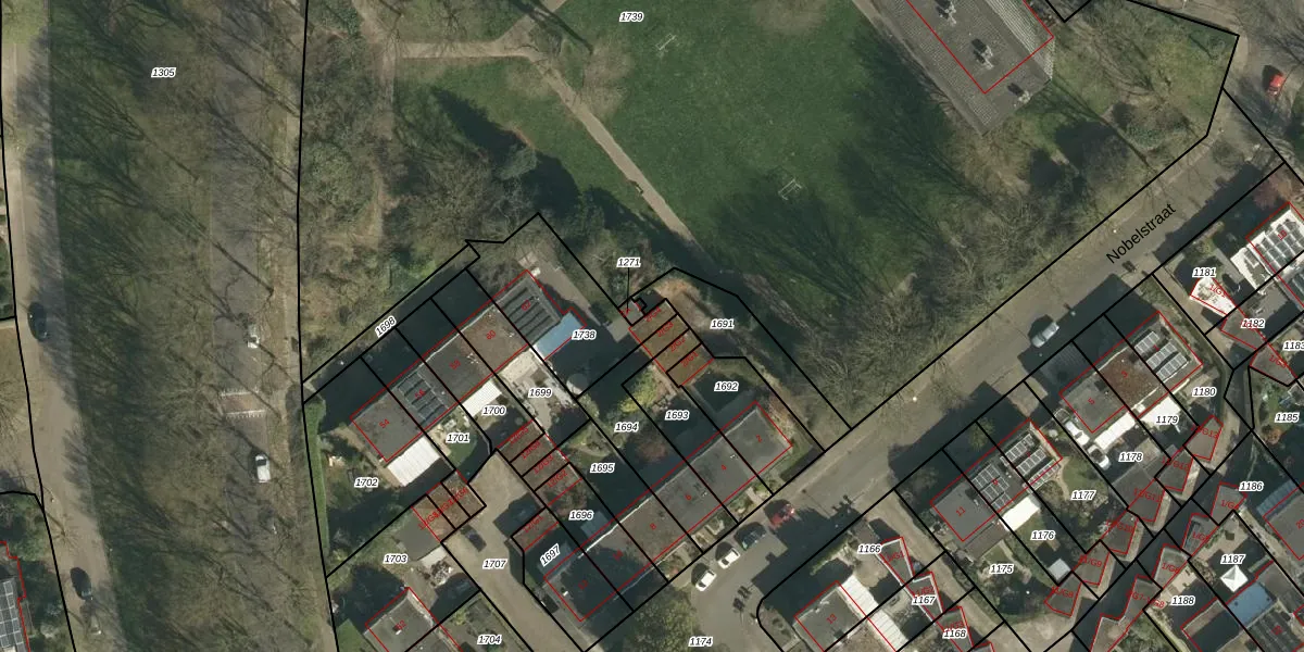 Het perceel waarop Nobelstraat 2-G4 staat heeft een oppervlakte van 386 m². Dit is een groot perceel. De perceeloppervlakte wordt geregistreerd door het Kadaster. Gedetailleerde informatie over de maten van dit perceel kunt u vinden in het rapport Kadastrale kaart met maatvoering van Nobelstraat 2-G4.