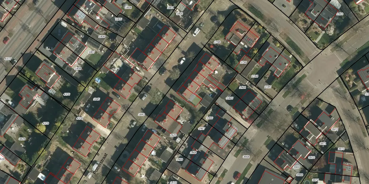 Het perceel waarop Potterstraat 41 staat heeft een oppervlakte van 3150 m². Dit is een zeer groot perceel. De perceeloppervlakte wordt geregistreerd door het Kadaster. Gedetailleerde informatie over de maten van dit perceel kunt u vinden in het rapport Kadastrale kaart met maatvoering van Potterstraat 41.