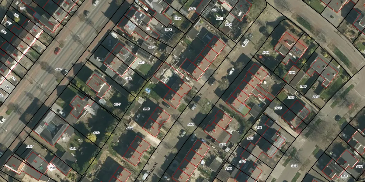 Het perceel waarop Potterstraat 54 staat heeft een oppervlakte van 3320 m². Dit is een zeer groot perceel. De perceeloppervlakte wordt geregistreerd door het Kadaster. Gedetailleerde informatie over de maten van dit perceel kunt u vinden in het rapport Kadastrale kaart met maatvoering van Potterstraat 54.