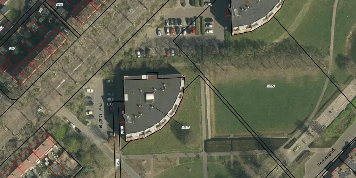 Het perceel waarop Prof. Oudflat 5 staat heeft een oppervlakte van 962 m². Dit is een groot perceel. De perceeloppervlakte wordt geregistreerd door het Kadaster. Gedetailleerde informatie over de maten van dit perceel kunt u vinden in het rapport Kadastrale kaart met maatvoering van Prof. Oudflat 5.