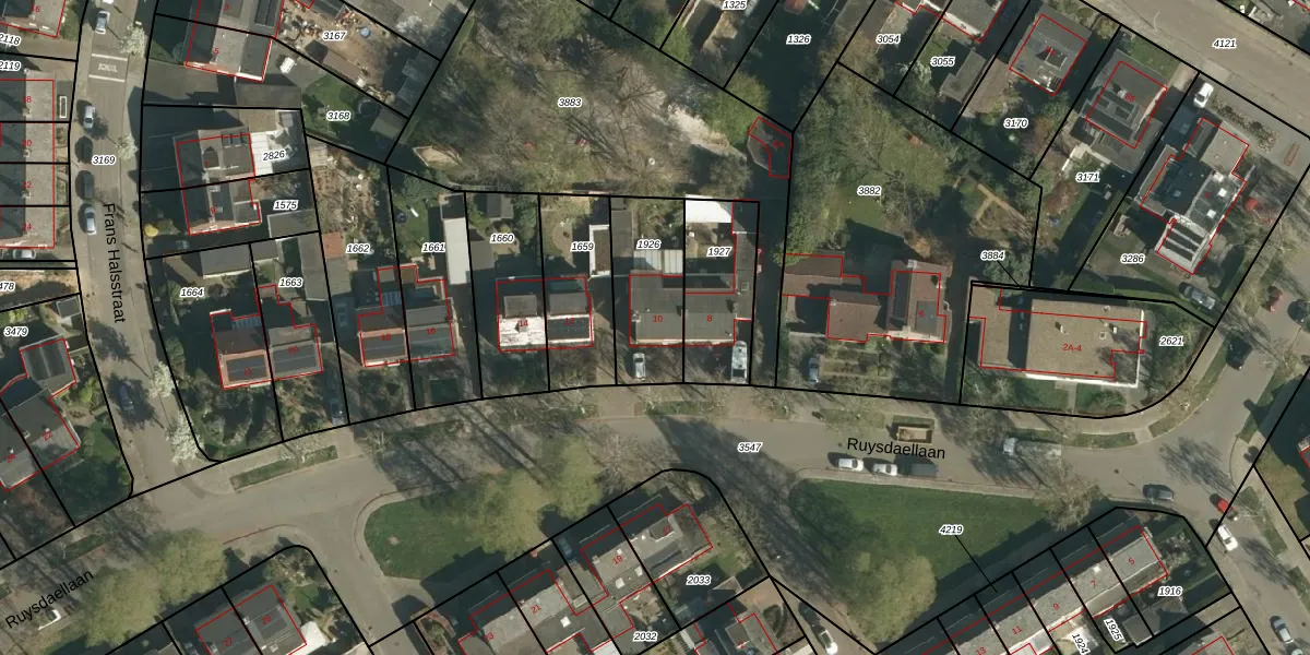Het perceel waarop Ruysdaellaan 10 staat heeft een oppervlakte van 308 m². Dit is een groot perceel. De perceeloppervlakte wordt geregistreerd door het Kadaster. Gedetailleerde informatie over de maten van dit perceel kunt u vinden in het rapport Kadastrale kaart met maatvoering van Ruysdaellaan 10.