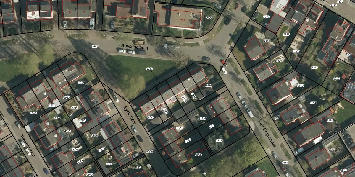 Ruysdaellaan 9 is gelegen op kadastraal perceel GLN00F1924. Deze kadastrale aanduiding is uniek en wordt gebruikt door het Kadaster om eigendomsrechten en andere zakelijke rechten vast te leggen. Het perceel maakt onderdeel uit van de kadastrale gemeente Geleen.