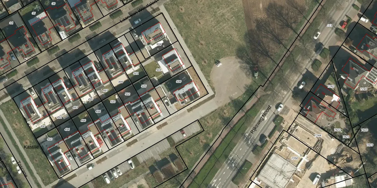 Het perceel waarop Toscane 82 staat heeft een oppervlakte van 400 m². Dit is een groot perceel. De perceeloppervlakte wordt geregistreerd door het Kadaster. Gedetailleerde informatie over de maten van dit perceel kunt u vinden in het rapport Kadastrale kaart met maatvoering van Toscane 82.