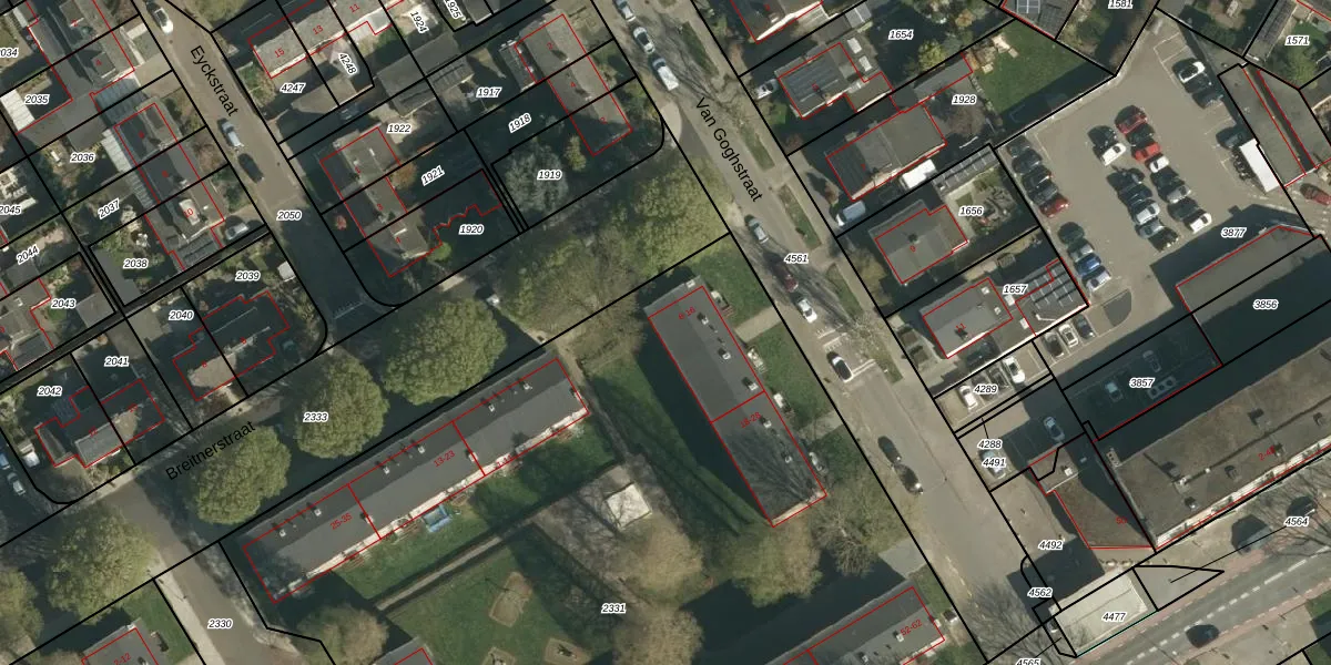 Het perceel waarop Van Goghstraat 14 staat heeft een oppervlakte van 6465 m². Dit is een zeer groot perceel. De perceeloppervlakte wordt geregistreerd door het Kadaster. Gedetailleerde informatie over de maten van dit perceel kunt u vinden in het rapport Kadastrale kaart met maatvoering van Van Goghstraat 14.