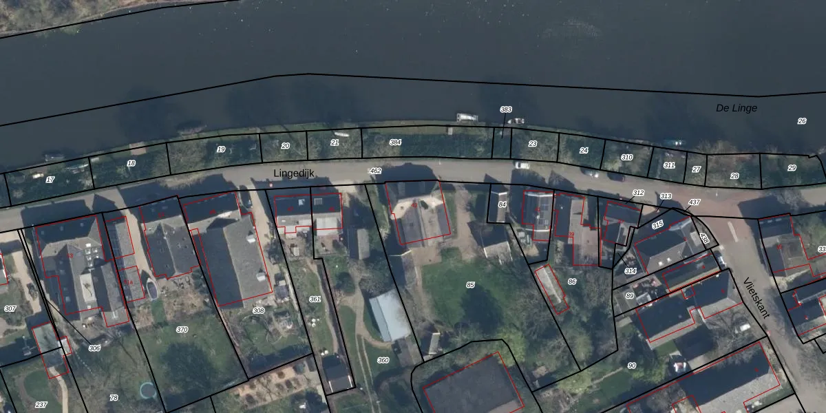 Het perceel waarop Lingedijk 43 staat heeft een oppervlakte van 1430 m². Dit is een zeer groot perceel. De perceeloppervlakte wordt geregistreerd door het Kadaster. Gedetailleerde informatie over de maten van dit perceel kunt u vinden in het rapport Kadastrale kaart met maatvoering van Lingedijk 43.