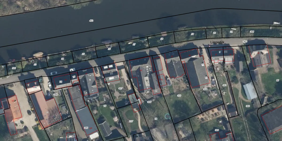 Het perceel waarop Lingedijk 53 staat heeft een oppervlakte van 1480 m². Dit is een zeer groot perceel. De perceeloppervlakte wordt geregistreerd door het Kadaster. Gedetailleerde informatie over de maten van dit perceel kunt u vinden in het rapport Kadastrale kaart met maatvoering van Lingedijk 53.