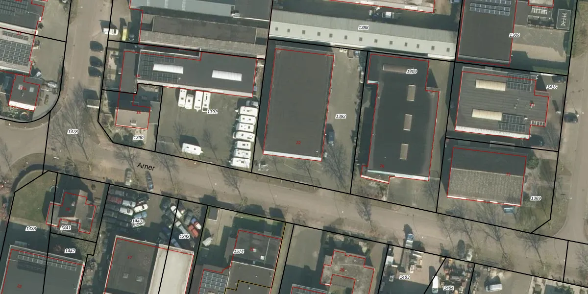 Het perceel waarop Amer 22 staat heeft een oppervlakte van 1621 m². Dit is een zeer groot perceel. De perceeloppervlakte wordt geregistreerd door het Kadaster. Gedetailleerde informatie over de maten van dit perceel kunt u vinden in het rapport Kadastrale kaart met maatvoering van Amer 22.