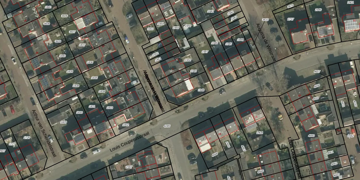 Het perceel waarop Augusta de Witstraat 1 staat heeft een oppervlakte van 287 m². Dit is een middelgroot perceel. De perceeloppervlakte wordt geregistreerd door het Kadaster. Gedetailleerde informatie over de maten van dit perceel kunt u vinden in het rapport Kadastrale kaart met maatvoering van Augusta de Witstraat 1.