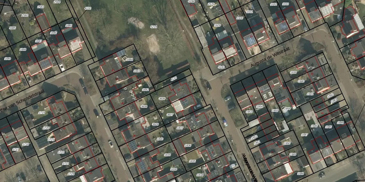 Het perceel waarop Augusta de Witstraat 16 staat heeft een oppervlakte van 245 m². Dit is een middelgroot perceel. De perceeloppervlakte wordt geregistreerd door het Kadaster. Gedetailleerde informatie over de maten van dit perceel kunt u vinden in het rapport Kadastrale kaart met maatvoering van Augusta de Witstraat 16.
