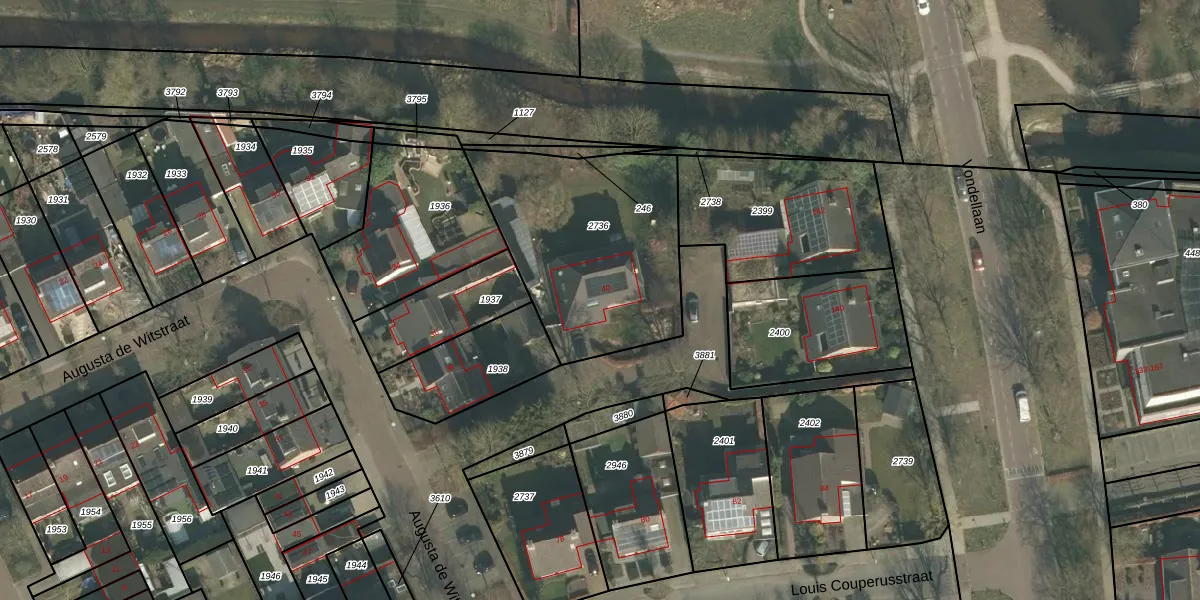 Het perceel waarop Augusta de Witstraat 40 staat heeft een oppervlakte van 946 m². Dit is een groot perceel. De perceeloppervlakte wordt geregistreerd door het Kadaster. Gedetailleerde informatie over de maten van dit perceel kunt u vinden in het rapport Kadastrale kaart met maatvoering van Augusta de Witstraat 40.