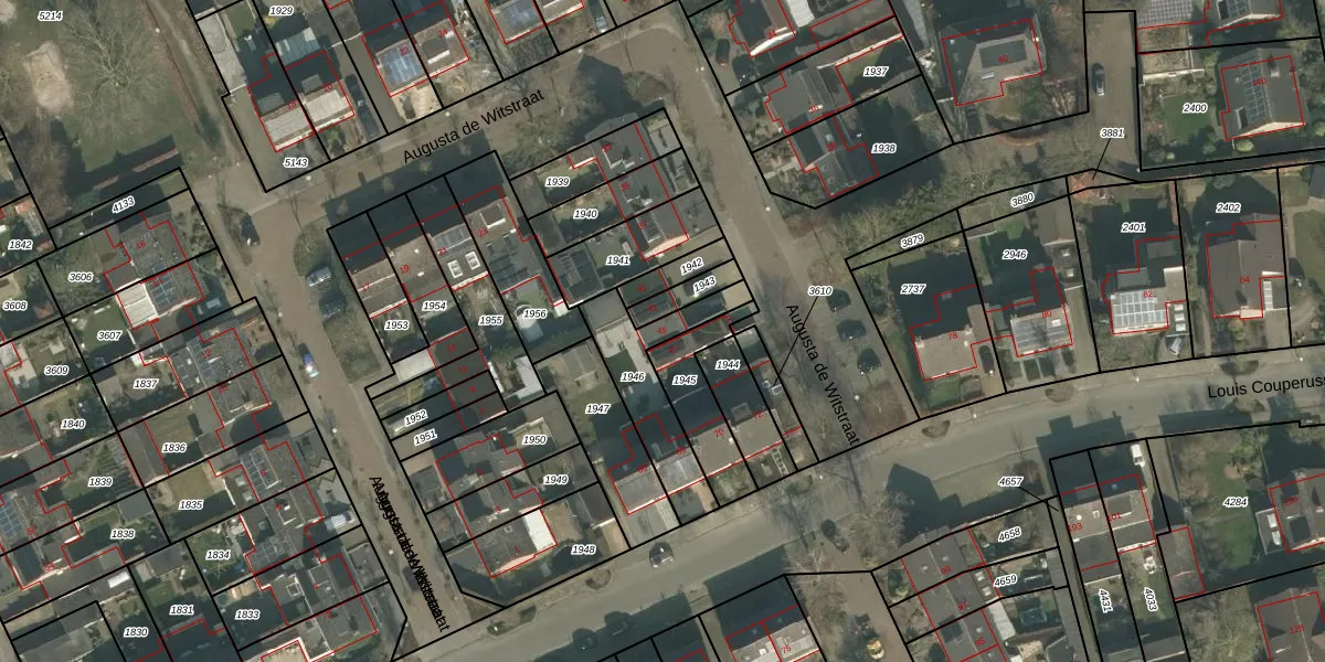 Het perceel waarop Augusta de Witstraat 45 staat heeft een oppervlakte van 297 m². Dit is een middelgroot perceel. De perceeloppervlakte wordt geregistreerd door het Kadaster. Gedetailleerde informatie over de maten van dit perceel kunt u vinden in het rapport Kadastrale kaart met maatvoering van Augusta de Witstraat 45.
