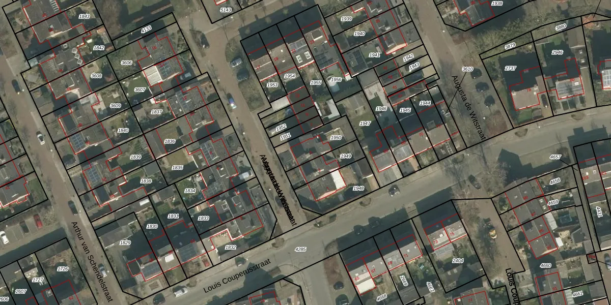 Het perceel waarop Augusta de Witstraat 5 staat heeft een oppervlakte van 223 m². Dit is een middelgroot perceel. De perceeloppervlakte wordt geregistreerd door het Kadaster. Gedetailleerde informatie over de maten van dit perceel kunt u vinden in het rapport Kadastrale kaart met maatvoering van Augusta de Witstraat 5.