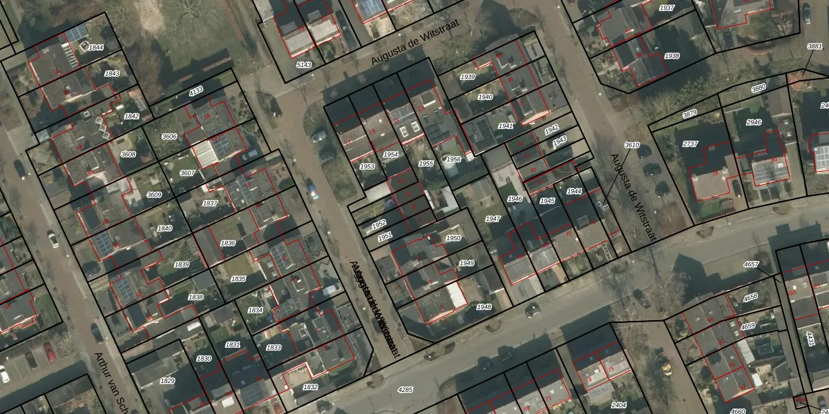 Het perceel waarop Augusta de Witstraat 9 staat heeft een oppervlakte van 62 m². Dit is een klein perceel. De perceeloppervlakte wordt geregistreerd door het Kadaster. Gedetailleerde informatie over de maten van dit perceel kunt u vinden in het rapport Kadastrale kaart met maatvoering van Augusta de Witstraat 9.