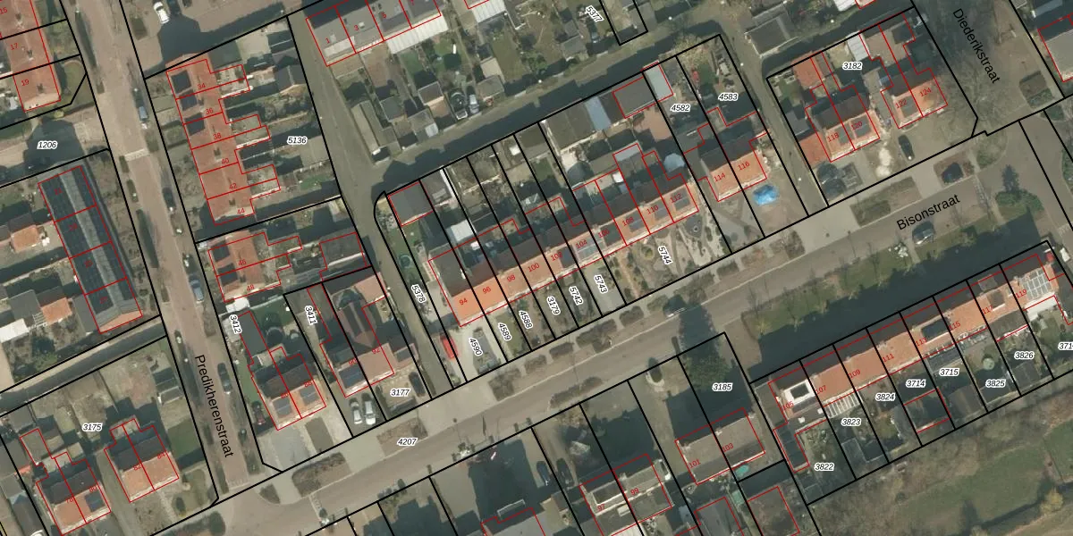 Het perceel waarop Bisonstraat 100 staat heeft een oppervlakte van 193 m². Dit is een middelgroot perceel. De perceeloppervlakte wordt geregistreerd door het Kadaster. Gedetailleerde informatie over de maten van dit perceel kunt u vinden in het rapport Kadastrale kaart met maatvoering van Bisonstraat 100.