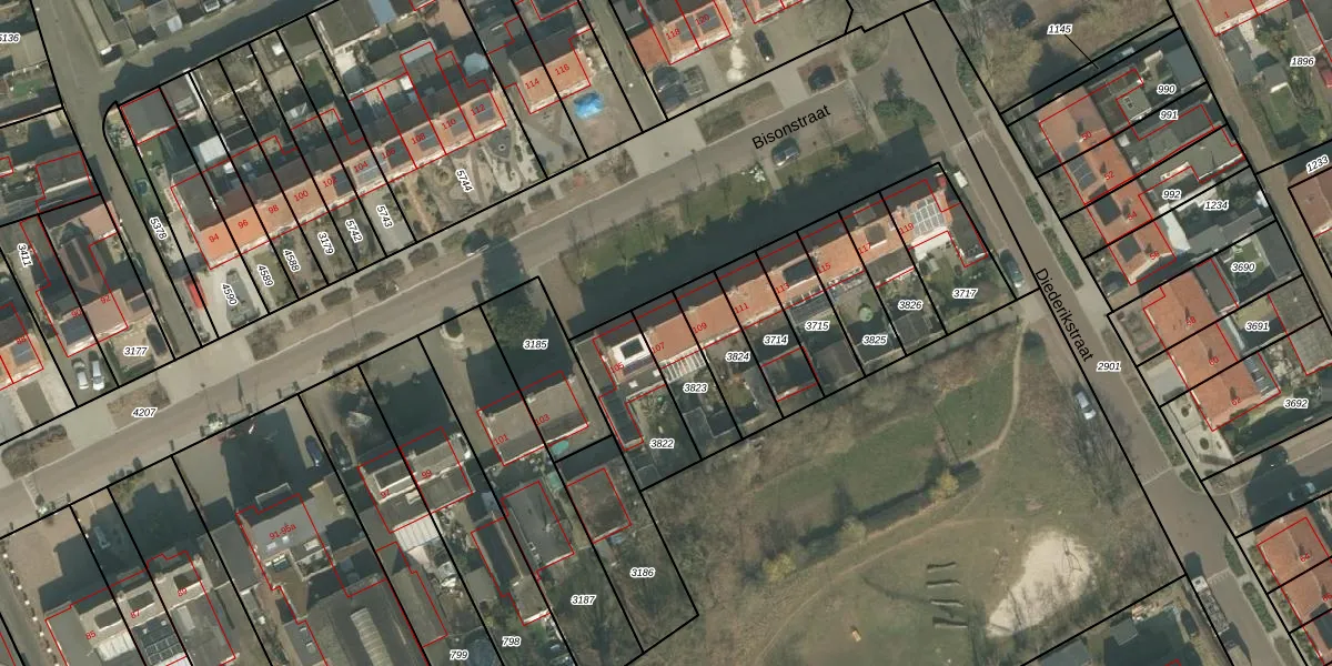 Het perceel waarop Bisonstraat 107 staat heeft een oppervlakte van 170 m². Dit is een middelgroot perceel. De perceeloppervlakte wordt geregistreerd door het Kadaster. Gedetailleerde informatie over de maten van dit perceel kunt u vinden in het rapport Kadastrale kaart met maatvoering van Bisonstraat 107.