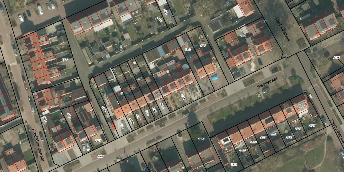 Het perceel waarop Bisonstraat 108 staat heeft een oppervlakte van 823 m². Dit is een groot perceel. De perceeloppervlakte wordt geregistreerd door het Kadaster. Gedetailleerde informatie over de maten van dit perceel kunt u vinden in het rapport Kadastrale kaart met maatvoering van Bisonstraat 108.