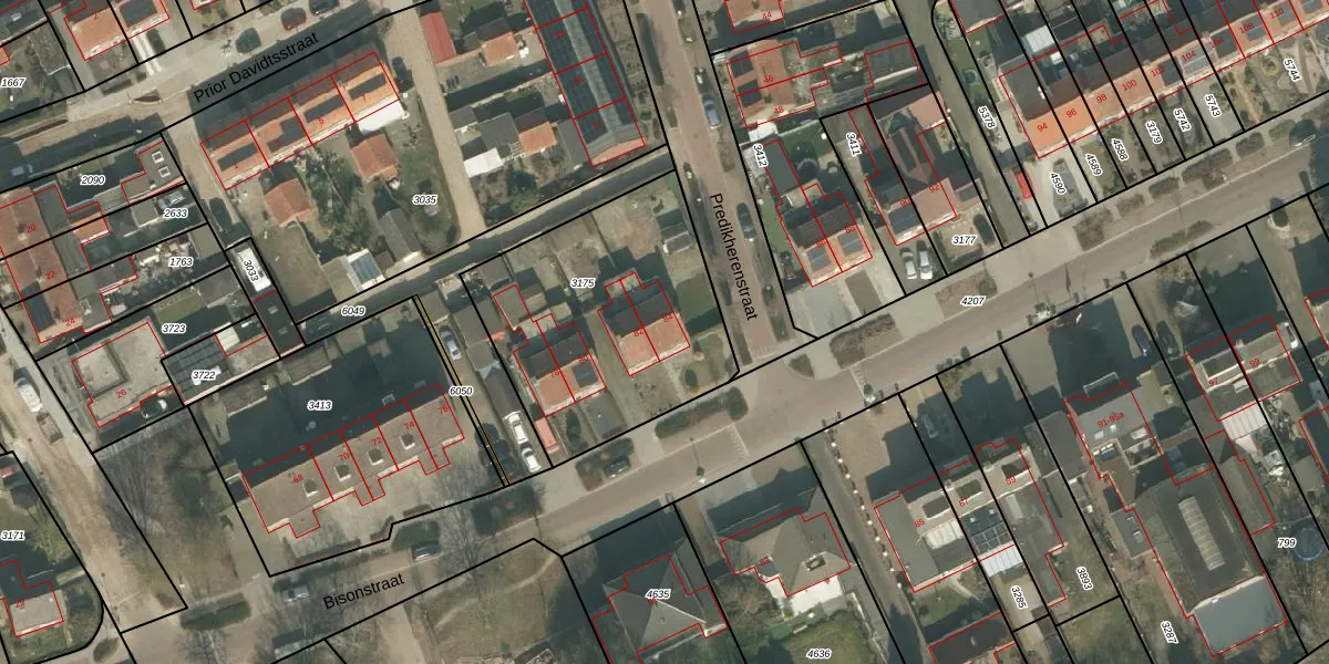 Het perceel waarop Bisonstraat 84 staat heeft een oppervlakte van 1087 m². Dit is een zeer groot perceel. De perceeloppervlakte wordt geregistreerd door het Kadaster. Gedetailleerde informatie over de maten van dit perceel kunt u vinden in het rapport Kadastrale kaart met maatvoering van Bisonstraat 84.