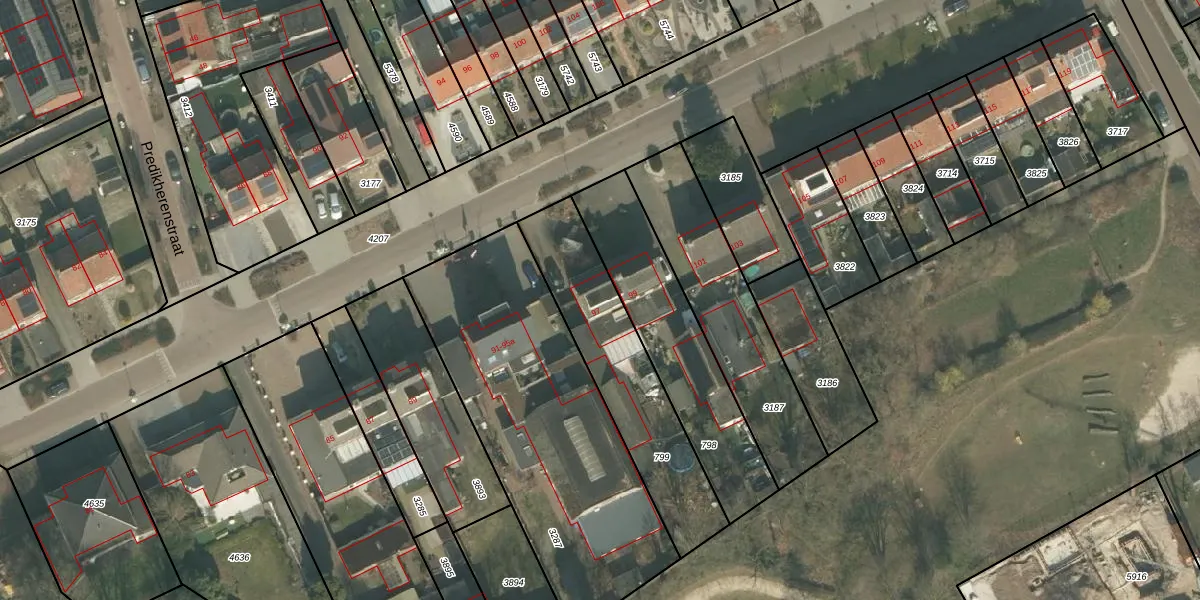 Het perceel waarop Bisonstraat 97 staat heeft een oppervlakte van 615 m². Dit is een groot perceel. De perceeloppervlakte wordt geregistreerd door het Kadaster. Gedetailleerde informatie over de maten van dit perceel kunt u vinden in het rapport Kadastrale kaart met maatvoering van Bisonstraat 97.