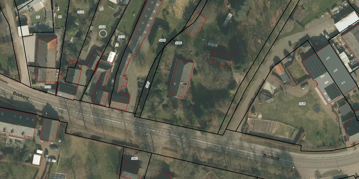 Het perceel waarop Boekent 16 staat heeft een oppervlakte van 9851 m². Dit is een zeer groot perceel. De perceeloppervlakte wordt geregistreerd door het Kadaster. Gedetailleerde informatie over de maten van dit perceel kunt u vinden in het rapport Kadastrale kaart met maatvoering van Boekent 16.