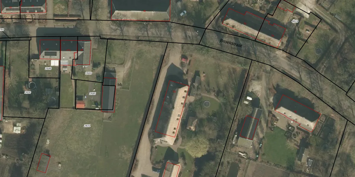 Het perceel waarop Broekstraat 53 staat heeft een oppervlakte van 8605 m². Dit is een zeer groot perceel. De perceeloppervlakte wordt geregistreerd door het Kadaster. Gedetailleerde informatie over de maten van dit perceel kunt u vinden in het rapport Kadastrale kaart met maatvoering van Broekstraat 53.