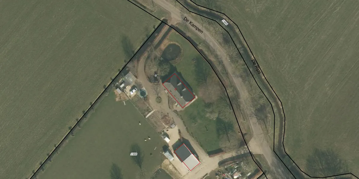 Het perceel waarop De Kampen 18 staat heeft een oppervlakte van 1,2 ha. Dit is een zeer groot perceel. De perceeloppervlakte wordt geregistreerd door het Kadaster. Gedetailleerde informatie over de maten van dit perceel kunt u vinden in het rapport Kadastrale kaart met maatvoering van De Kampen 18.