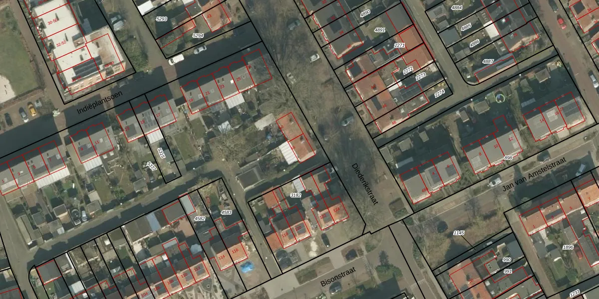 Het perceel waarop Diederikstraat 55 staat heeft een oppervlakte van 4451 m². Dit is een zeer groot perceel. De perceeloppervlakte wordt geregistreerd door het Kadaster. Gedetailleerde informatie over de maten van dit perceel kunt u vinden in het rapport Kadastrale kaart met maatvoering van Diederikstraat 55.