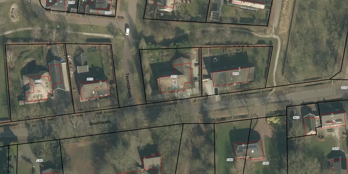 Het perceel waarop Doonheide 27 staat heeft een oppervlakte van 1009 m². Dit is een zeer groot perceel. De perceeloppervlakte wordt geregistreerd door het Kadaster. Gedetailleerde informatie over de maten van dit perceel kunt u vinden in het rapport Kadastrale kaart met maatvoering van Doonheide 27.