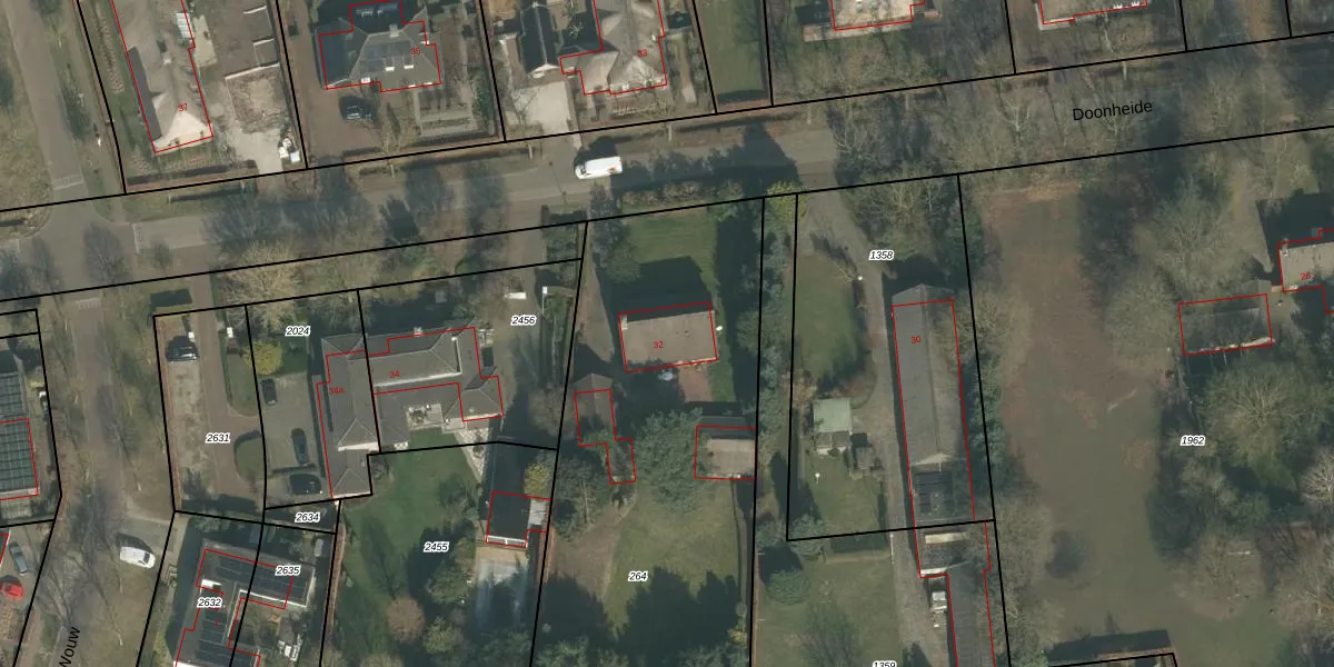 Doonheide 32 is gelegen op kadastraal perceel GMT00O264. Deze kadastrale aanduiding is uniek en wordt gebruikt door het Kadaster om eigendomsrechten en andere zakelijke rechten vast te leggen. Het perceel maakt onderdeel uit van de kadastrale gemeente Gemert.