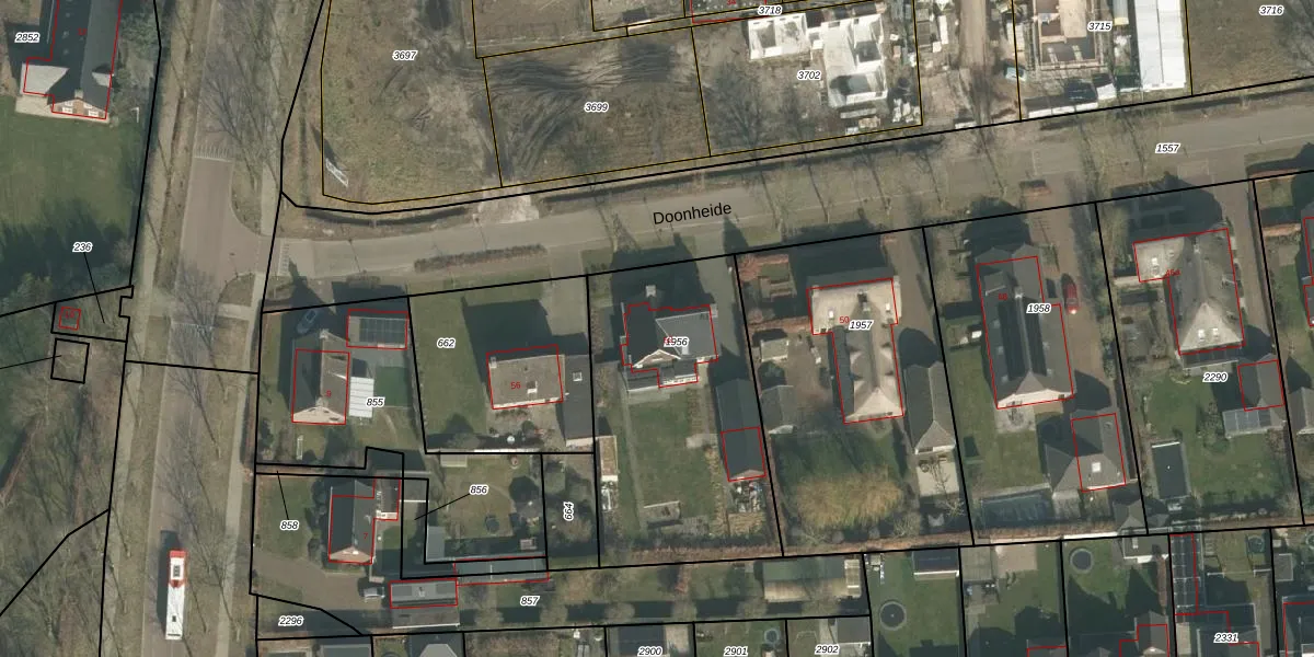 Doonheide 52 is gelegen op kadastraal perceel GMT00O1956. Deze kadastrale aanduiding is uniek en wordt gebruikt door het Kadaster om eigendomsrechten en andere zakelijke rechten vast te leggen. Het perceel maakt onderdeel uit van de kadastrale gemeente Gemert.