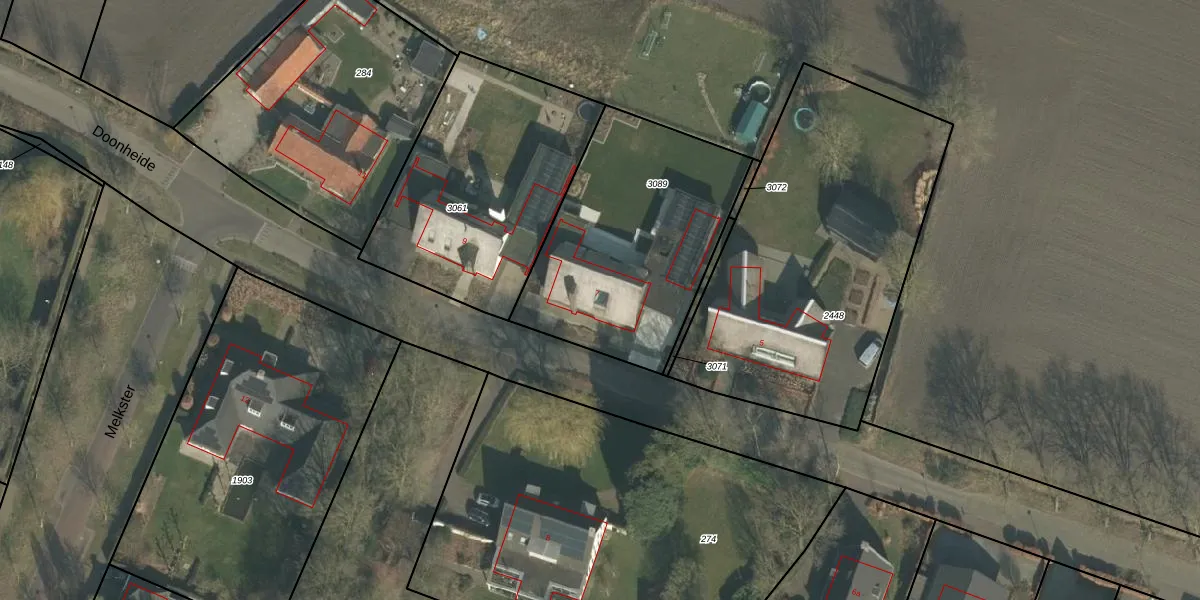 Het perceel waarop Doonheide 7 staat heeft een oppervlakte van 1044 m². Dit is een zeer groot perceel. De perceeloppervlakte wordt geregistreerd door het Kadaster. Gedetailleerde informatie over de maten van dit perceel kunt u vinden in het rapport Kadastrale kaart met maatvoering van Doonheide 7.
