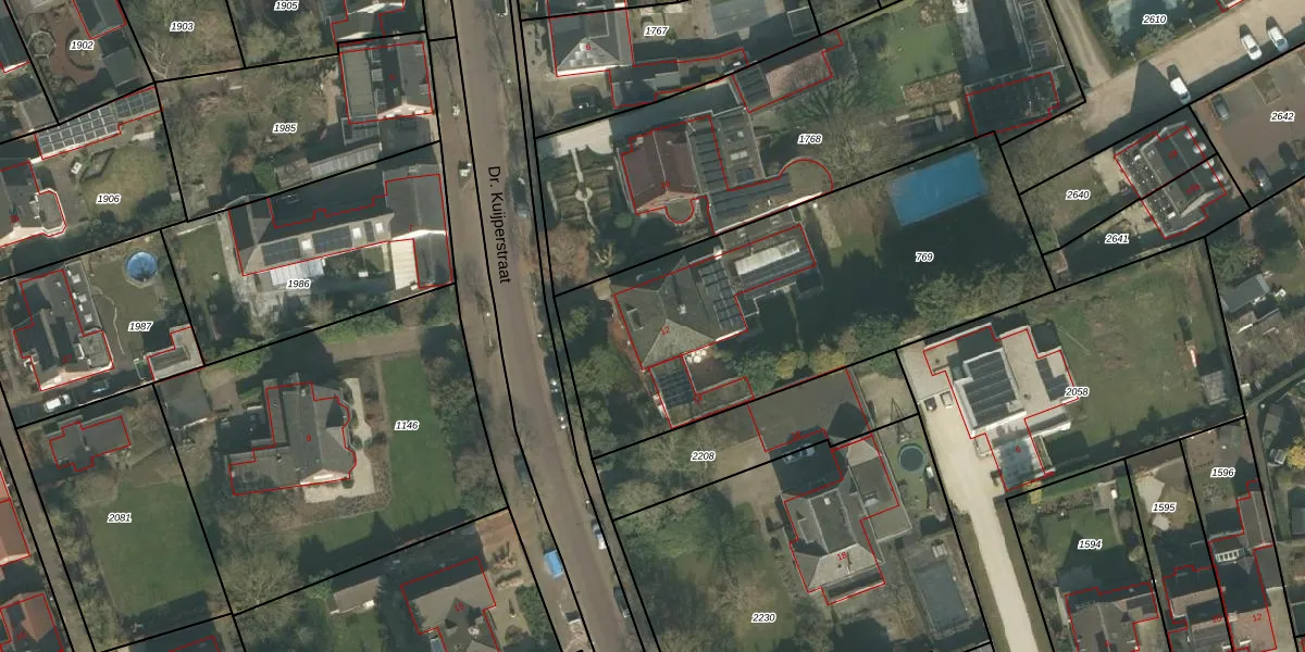 Het perceel waarop Dr. Kuijperstraat 12 staat heeft een oppervlakte van 1915 m². Dit is een zeer groot perceel. De perceeloppervlakte wordt geregistreerd door het Kadaster. Gedetailleerde informatie over de maten van dit perceel kunt u vinden in het rapport Kadastrale kaart met maatvoering van Dr. Kuijperstraat 12.
