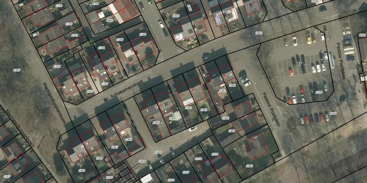 Dr. Schaepmanstraat 13 is gelegen op kadastraal perceel GMT00M1963. Deze kadastrale aanduiding is uniek en wordt gebruikt door het Kadaster om eigendomsrechten en andere zakelijke rechten vast te leggen. Het perceel maakt onderdeel uit van de kadastrale gemeente Gemert.