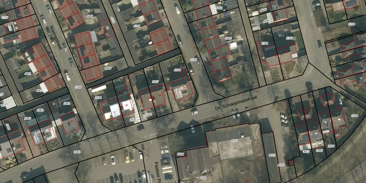 Dr. Schaepmanstraat 36 is gelegen op kadastraal perceel GMT00M2038. Deze kadastrale aanduiding is uniek en wordt gebruikt door het Kadaster om eigendomsrechten en andere zakelijke rechten vast te leggen. Het perceel maakt onderdeel uit van de kadastrale gemeente Gemert.