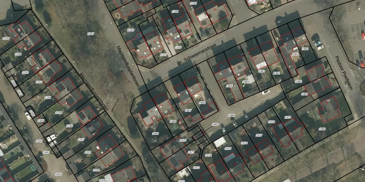 Dr. Schaepmanstraat 5 is gelegen op kadastraal perceel GMT00M1967. Deze kadastrale aanduiding is uniek en wordt gebruikt door het Kadaster om eigendomsrechten en andere zakelijke rechten vast te leggen. Het perceel maakt onderdeel uit van de kadastrale gemeente Gemert.